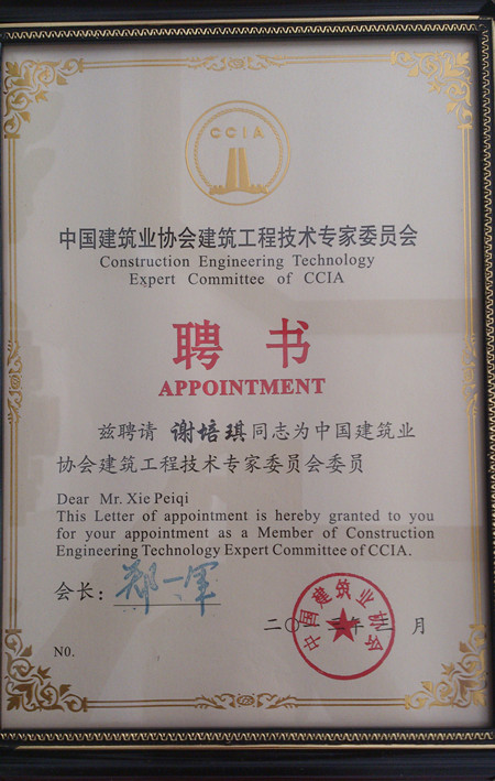 2013年3月,中國建筑業(yè)協(xié)會會長鄭一軍下發(fā)聘書,茲聘請我公司謝培琪同志為中國建筑業(yè)協(xié)會建筑工程技術(shù)專家委員會委員。